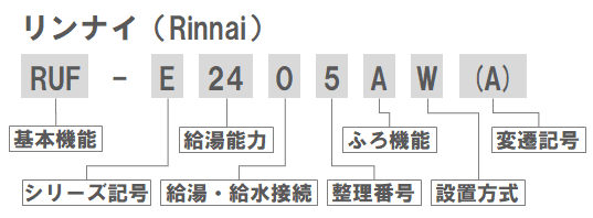 リンナイ、ノーリツ、パロマ、パーパスのガスふろ給湯器の型番の見方を紹介