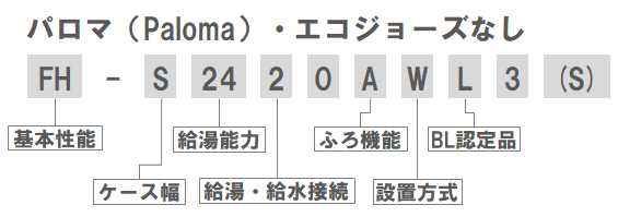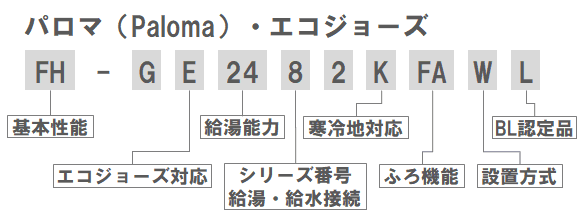 (パロマはエコジョーズ対応・非対応、暖房用熱源機か否かなど、製品のカテゴリによって型番の付け方それぞれ違うようです。統一的な型番が存在しないため、型番の見方が紹介されていないのではないか、とも考えられます。)